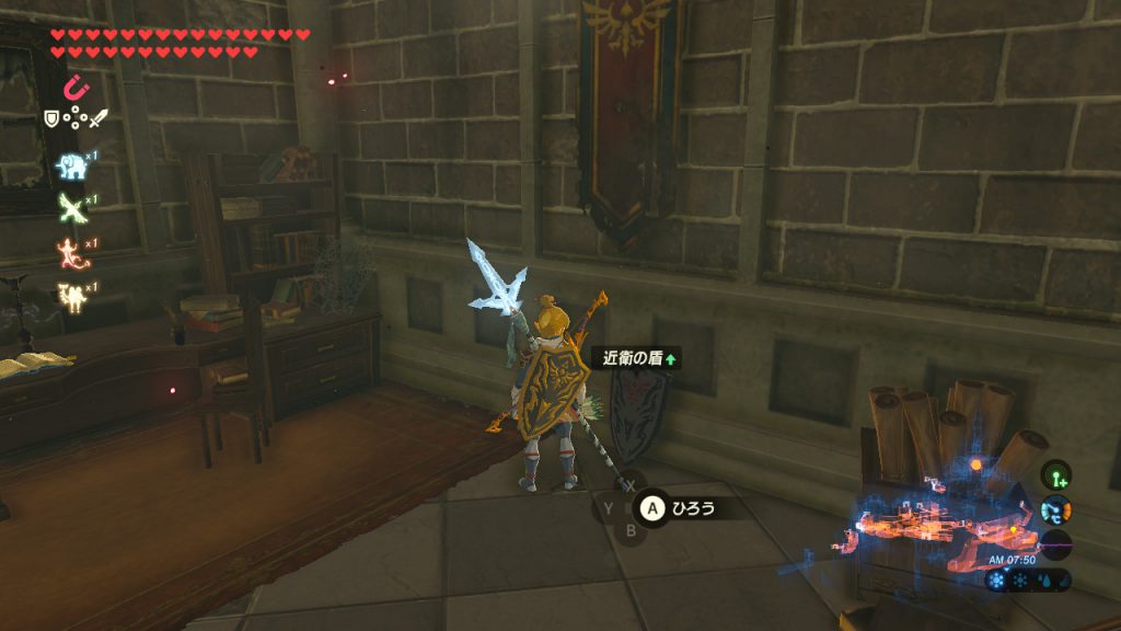 - ハイラル城(浮いてるほう)の図書館の壁際に兵士の弓と矢が10本ある。祠から城を右に見るように飛んで、崖下にあいている隙間から入れば敵と戦わずに行ける。