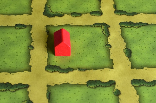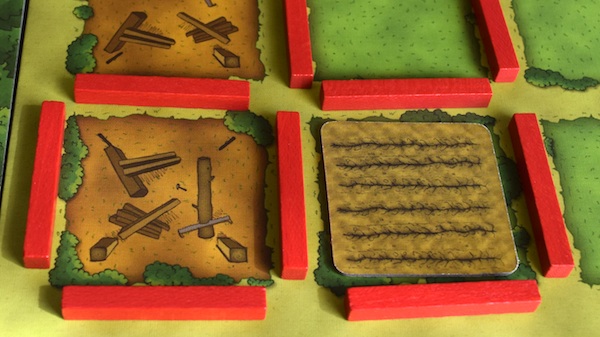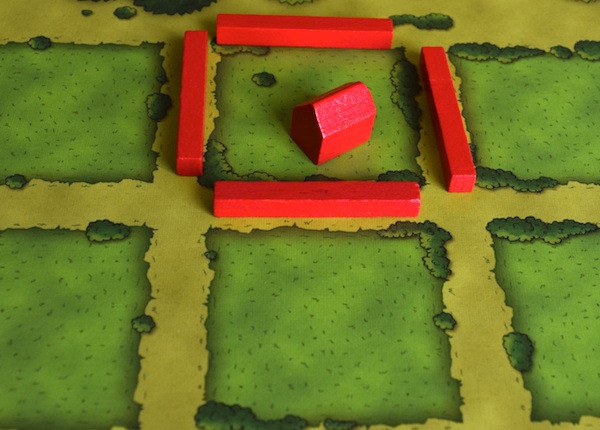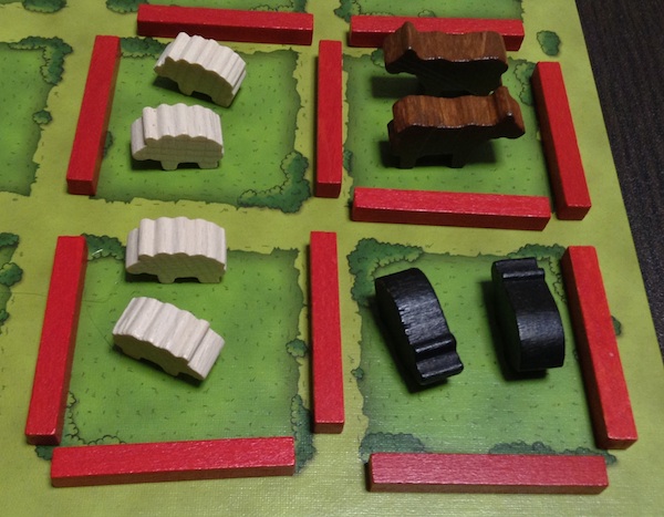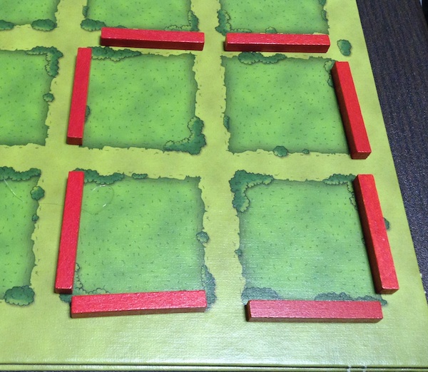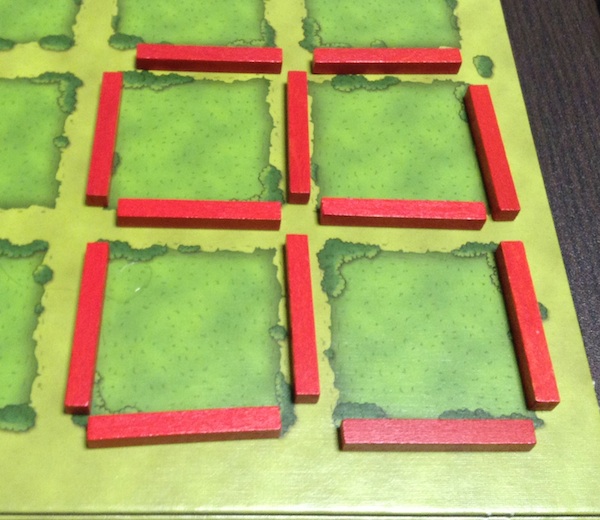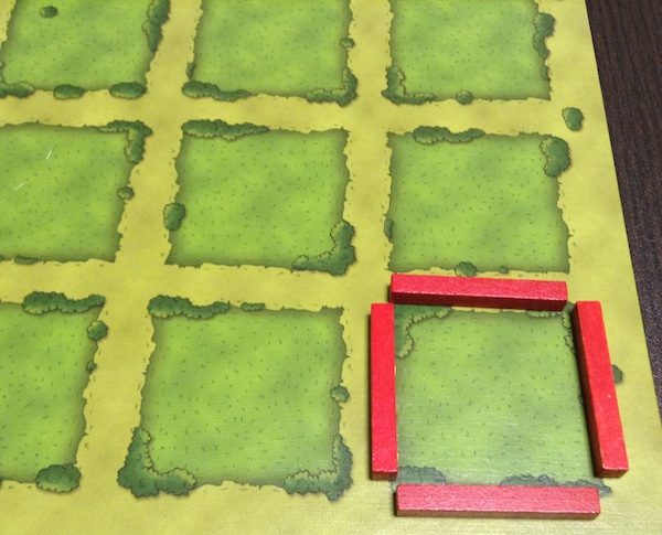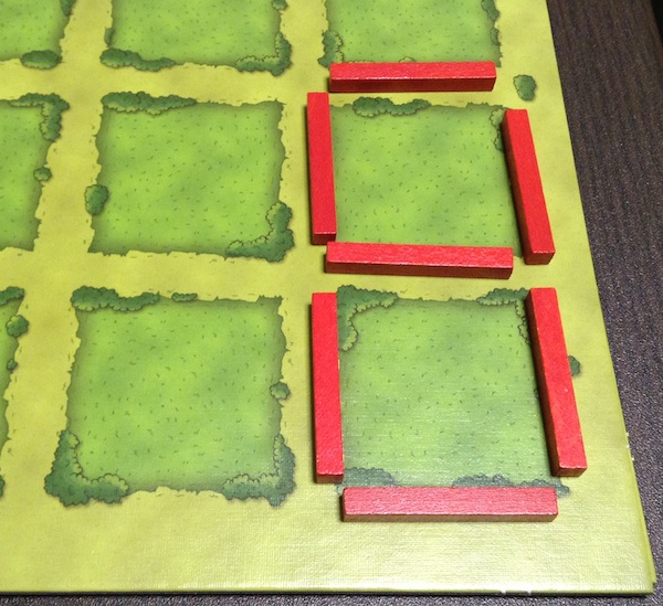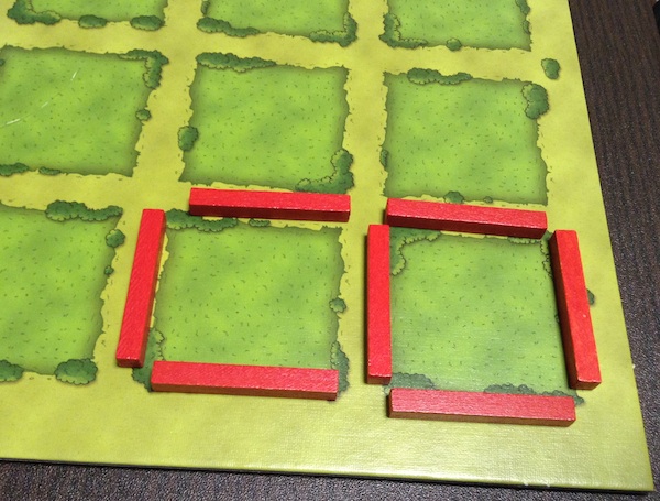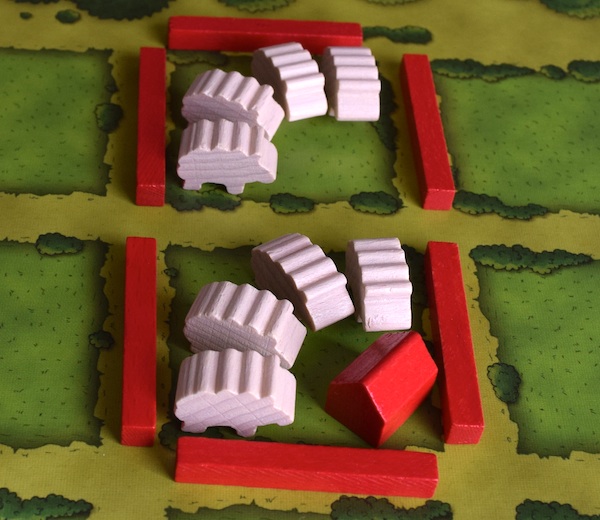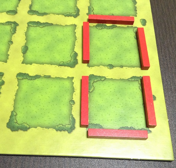 ちなみに、牧場ではないところに厩を置くこともできる。ただし、牧場の外にある厩は得点にはならない。もちろん、あとから柵で囲えば(厩のあるマスを牧場にすれば)、得点にすることはできる。