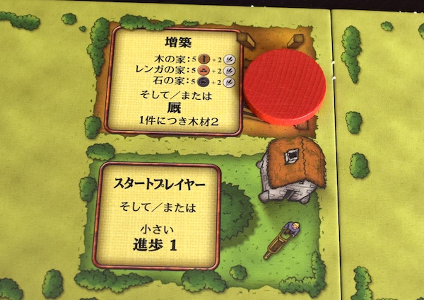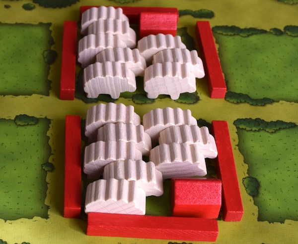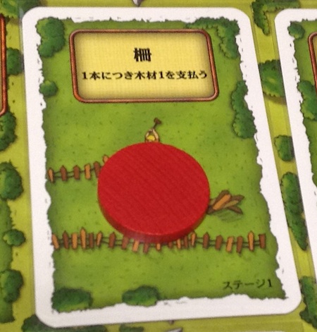 厩を牧場に置くと、家畜を置ける数が2倍になる。マスひとつの牧場には、通常では家畜2頭しか置くことができないけど、厩を置くことで家畜4頭まで置くことができるようになる。