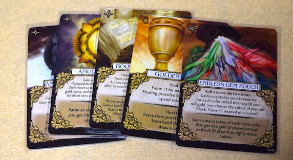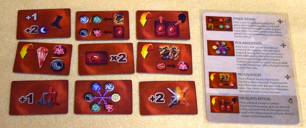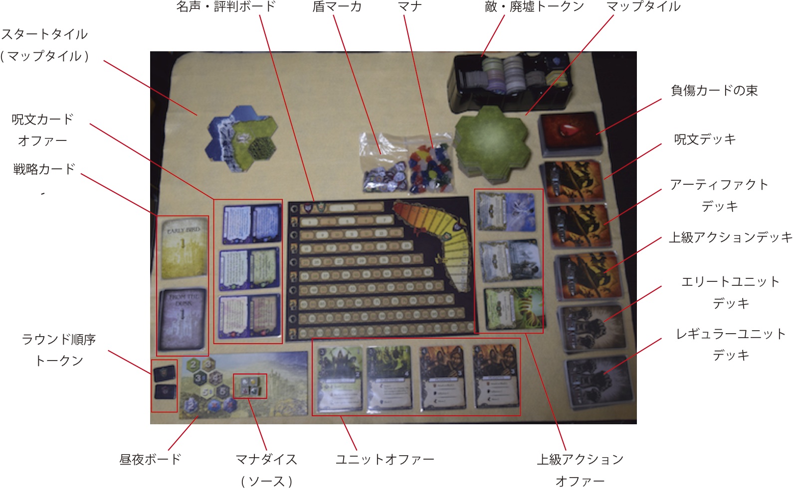 写真の右側に並んでるカード(デッキ)は、下からそれぞれ「ユニット(レギュラー)デッキ、ユニット(エリート)デッキ、上級アクションデッキ(長いから単にアクションデッキと呼ぶ)、アーティファクトデッキ、呪文デッキ、負傷カードの束となっている。並べる順序はこの順番でなくてもいいけど、どれがどれかは区別がつくようにしておく必要がある。負傷カードだけは、表向きにして積んでおく。