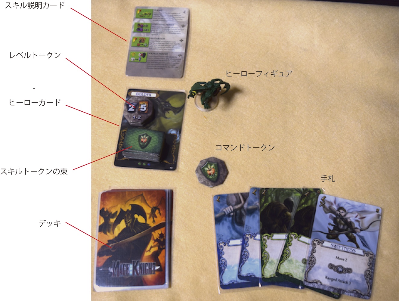 選んだヒーローのフィギュアとヒーローカード、トークン(4種類)、初期デッキ、スキル説明カードをそれぞれ受けとる。フィギュアは見ての通り。プレイ中はマップ上に置くんだけど、最初の時点では各プレーヤーのプレイエリアに置いておく。ヒーローカードは、みたまんまヒーローが描かれたカード。各ヒーローごとに1枚ずつあるので、それを受けとってプレイエリアに置いておく。