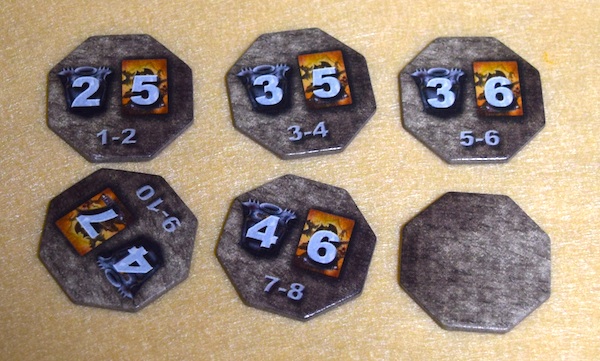 表に数字がかいてあるトークンは、ヒーローがそのレベルで持てるカードの枚数と、防御力を表している。一番下が 9-10 で、その上が 7-8, その上が 5-6 ・・・となるように重ねていって、一番上が 1-2 になるようにする。左の数値が防御力で、右の数値は手札の枚数になっている。最初はレベル 1 から始まるので、一番上にある 1-2 のトークンに表示されている数値が適用される。