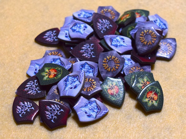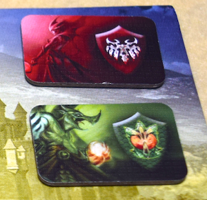 シールドトークンは、盾の形をしていて紋章が描かれている。これは、ゲーム中にいろいろな目的で使われる。ゲームエリアのセッティングで最低でも 2 個は使うので、とりあえず 2 個は受けとってプレイエリアのどこかに置いておく。