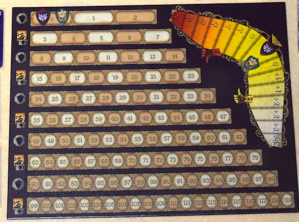 名声ポイントを得るたびに、シールドトークンを 1,2 … と動かしていく。名声を得てシールドトークを置く列が変わったら、そこでレベルがあがったことになる。レベルアップについては、プレイの流れのところで説明する。