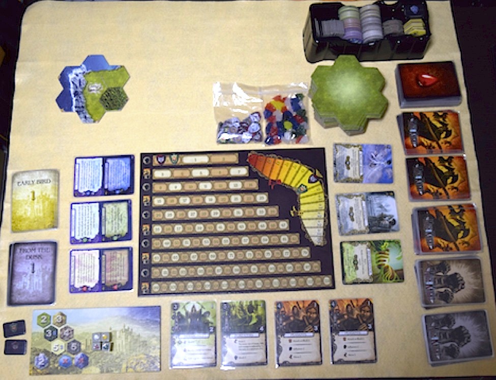・・・といったところで、やっと準備はおわり。個人的には、アクションデッキとかユニットデッキとかはそう頻繁にはめくらないので、別の場所に置いておいても良い気がする。とかくこのゲーム、小さいテーブルでやるとすぐマップタイルを置くスペースが足りなくなるので・・・。