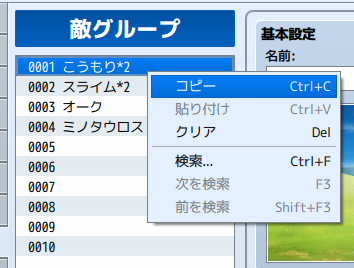 このウィンドウは、ゲームの中に登場するすべてのキャラクタ、敵キャラ(モンスター)、アイテム、武器、防具などを作ったり編集したりするウィンドウです。このウィンドウの左側にある「敵グループ」というタブを押すと、モンスターのグループを確認できます。