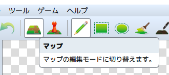OKを押すと、何も地形が置かれていないマップができます。あとは、初級編でマップを作った時と同じように、左側のパレットから地形(タイル)を選んで、マップを描いていきます。マップを描くときは、上のアイコンで「マップの編集」を選んでおくことを忘れないように。