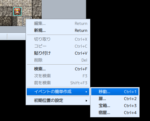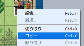 なお、イベントが設定してあるマスの上では「貼り付け」ができません。イベントを張り付けなおすときは、先に「削除」する必要があります。削除してから、