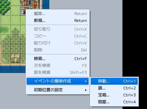 扉を作りには、イベント編集モードにしてから「イベントの簡単作成」のメニューで作れます。