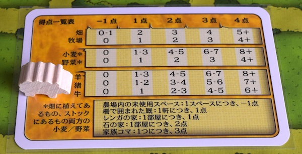 いずれの家畜も、数に応じて得点になる。牛はだいたい1匹1点(上限4点)。羊と猪は数に応じた得点になっていて、何匹で何点になるかは得点カードに書かれている。1頭も持っていないと、マイナス点になる。